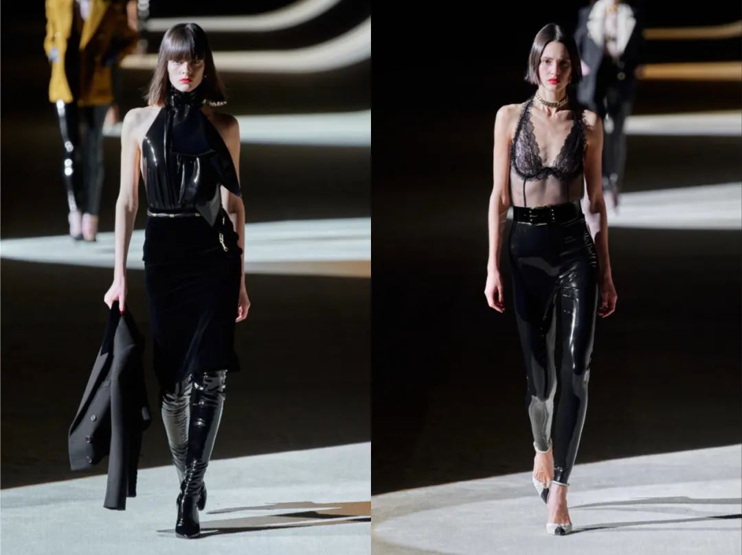 圣罗兰(Saint Laurent)2020秋冬高级成衣系列,裹身的乳胶(Latex)类单品贯穿了整个集合,强调性感的同时还模拟出了SM的氛围。
