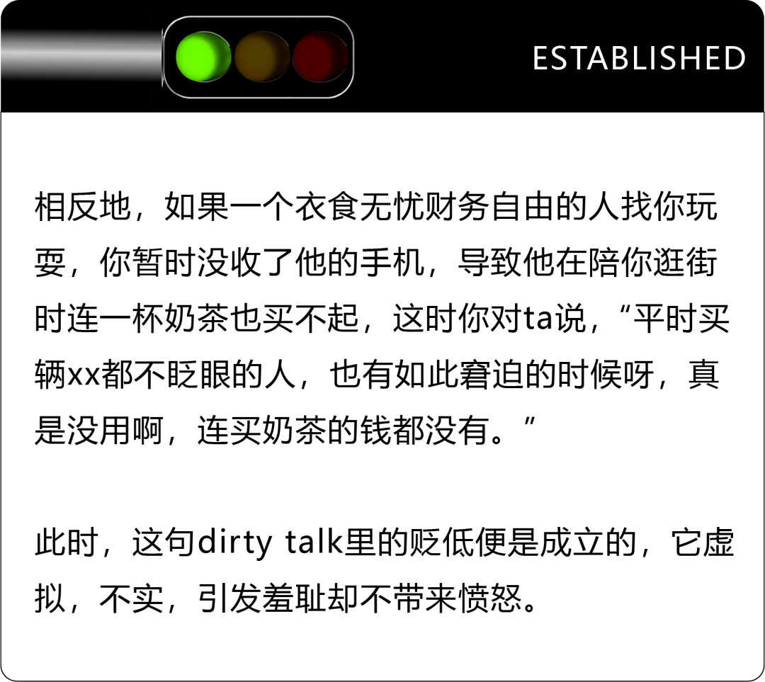 比如唤起对方的羞耻感,禁忌感,让彼此更好地进入情趣状态等等,但如果只是为了贬低而贬低,为了羞辱而羞辱,以蹂躏对方的尊严强化自己的自尊,则会陷入“语言暴力”和“身份沙文主义”的漩涡,这不是我们追求的目标。
