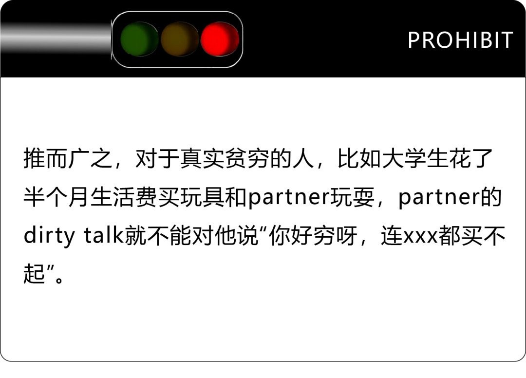 先不论事件中谁对谁错,这便引出了Dirtytalk的第二个禁区——要细心了解partner的心理禁地和底线,从而绕过它们,不去触碰它们。